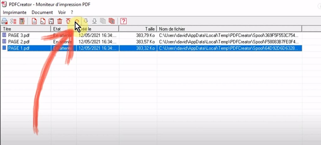 Une fois que PDF Creator ait pris l’impression en compte, vous devriez voir une fenêtre apparaitre. Cliquez alors sur « Mettre en file d’attente ».